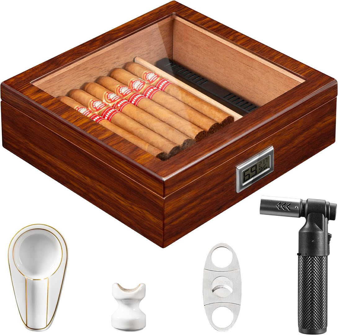 • 【Provide All You Need】 The cigar humidor box provides everything needed to enjoy cigars in style. You'll get a refillable & adjustable cigar torch (No Gas Included) with powerful flame easily lights your cigar; a sharp cigar cutter ensures clean, precise cut; a cigar holder and a cigar ashtray can keep your cigar horizontal and stable. Just prepare your favorite cigars and indulge in the true pleasure