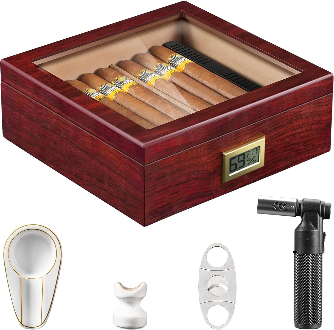 Flauno Cigar Humidor with Torch, Ashtray, Holder, Cutter, Digital Hygrometer, Humidifier, Divider, Cedar Wood Lining Desktop Humidor for 40-60 Cigars, High Gloss Finish Cigar Box for Africionado